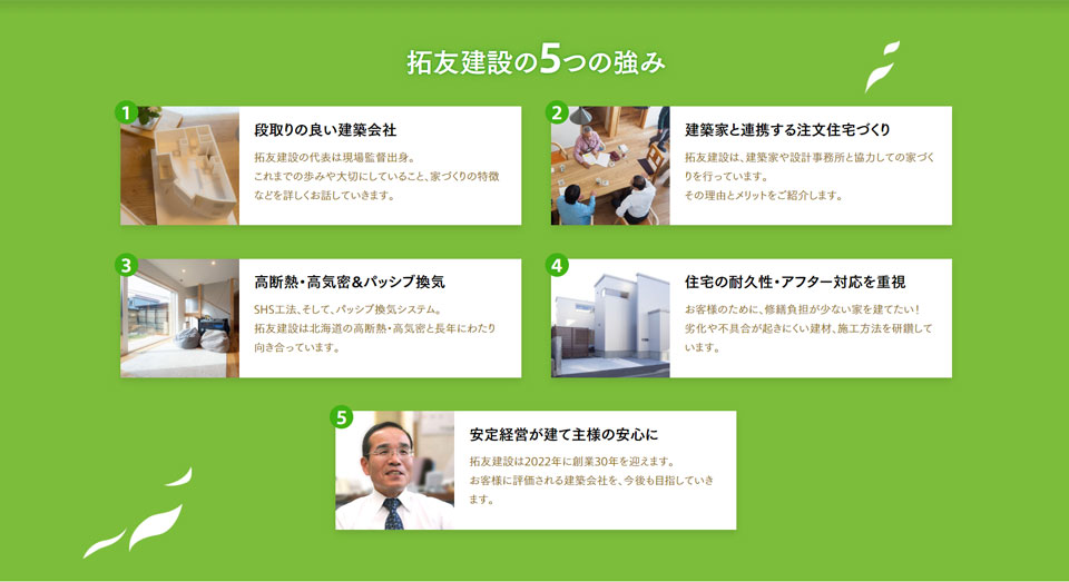 拓友建設の5つの強みをわかりやすく紹介しています。