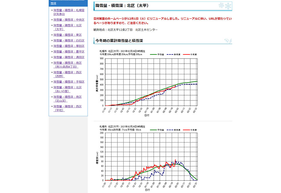 北区は、雪が多いと言われるあいの里にも観測地点があります。こちらは積雪90cm、平年値70cmですからここも多め。累計降雪量では今年448cm、平年値407cmですから累計も平年より多いですね。「あいの里は雪が多い」と言われますが、過去の観測値からも実証されているようです。