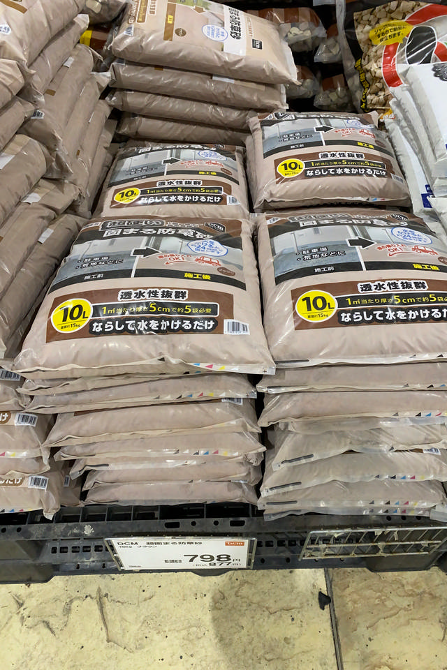 レンガや枕木を敷いた庭の目地部分をこの防草砂で埋めて雑草が生えないようにする、など補助的な使い方が向いているようです。