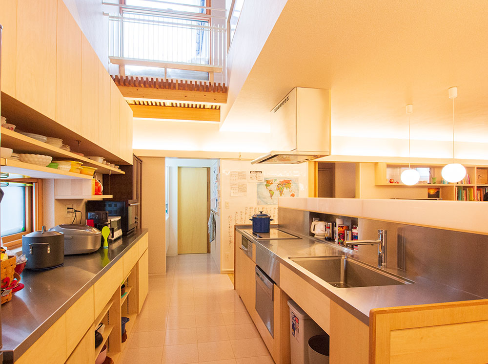 キッチンにこだわる人の夢は、やはりオーダーキッチンでしょう。キャビネットを造作し、シンク、水栓、食洗機など全てお好みのパーツを組みあわせてレイアウトや寸法も自由自在になります。 上記の事例でも、キッチンの横に収納を設けたり、シンク下にゴミ箱を収納し、背後の収納はよく使う鍋などをオープン収納にするなど、細かな工夫がされています。また、採光のため2階の高窓を使って暗くならない工夫も。これは、住宅設計と一体で考えたキッチンだからできること。