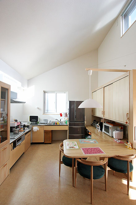 お客様が憧れるレイアウトです。妻が家族の気配を感じて調理したいという要望だけでなく、夫が家事をする妻と会話したい、という思いもあるようです。