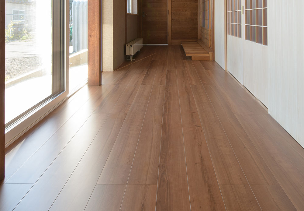 無垢フローリングでは原木から製造する過程で、歩留まり(製造効率)を良くするために幅が75~105mmと狭いものが多いのですが、複合フローリングではそうした制約が無いため、150mm幅など幅広の製品があります。また、ワックス掛けなどのメンテナンスは原則必要がなく、ある程度の防水性もあるため、お手入れはとても楽です。