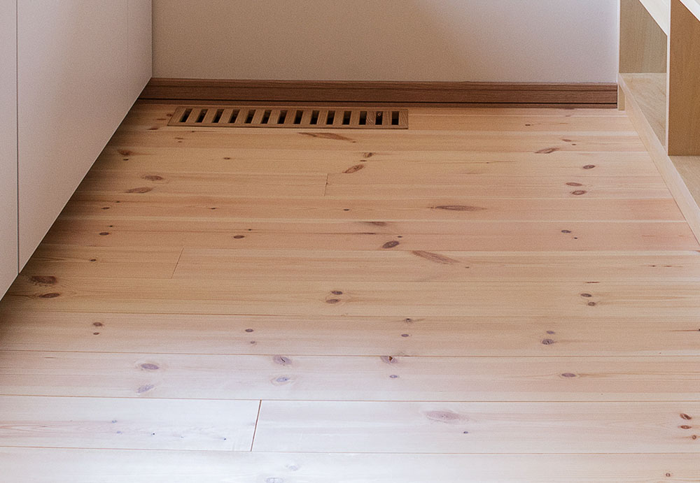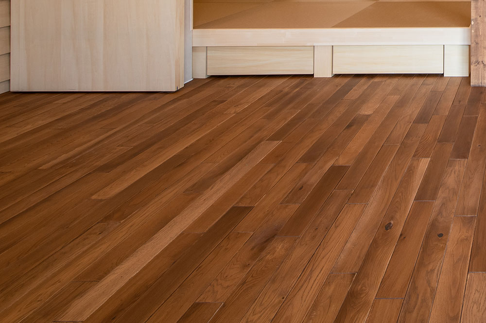「無垢フローリング」は1枚板で作っており、貼り合わせをしていないので接着剤を使用していません。表面にキズが付いてもヤスリをかけることで新品同様になります。施工したばかりの時は、木の香りが漂ってきてそれが魅力だというお客さまもいらっしゃいます。