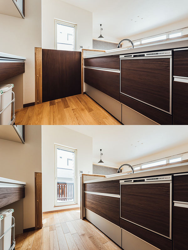 キッチンの入口にはこのような造作した引戸があります。Y様には小さなお子さまと猫ちゃんがいます。間違ってキッチン内に入り込まないように、それでいて使わない時は目立たないように、ということで引戸を造作しました。