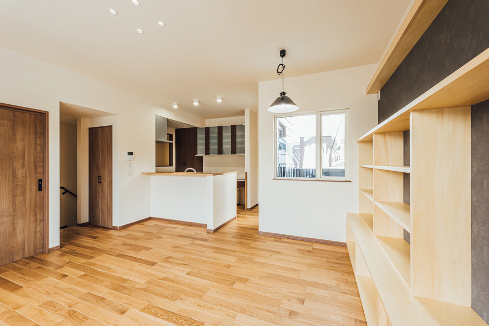 このほか、リビングの壁にAVボード、キッチンに食品庫、洋室に机などを造作。機能的な造りで使いやすくなっています。キッチンからバルコニーに直接出ることも可能で、洗濯物を干すのにぴったりです。
