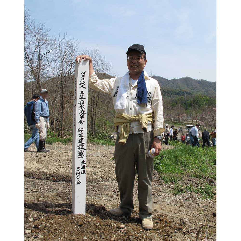 そう考えて、2007年(平成19年)から植樹を行っています。長く放置され荒れた空知地方・三笠の森をもとに戻す植樹計画を主催しているのが、学生時代からの知り合いでもある高篠和憲さん。その活動に賛同し、ずっと参加しております(ここ2年ほどはコロナ渦で中止となりました)。