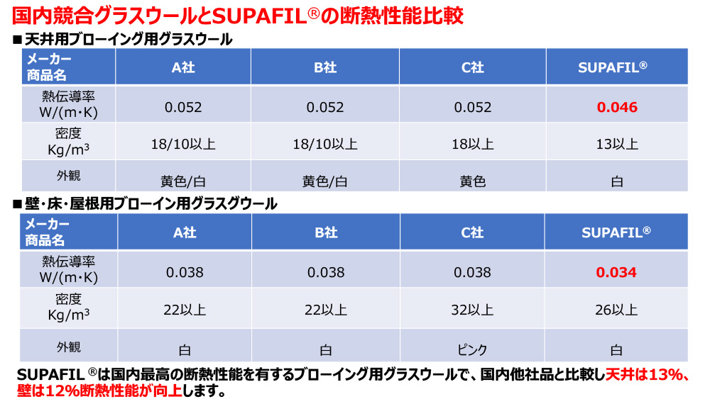 SUPAFIL®の特長は、何といっても高い断熱性能。上の表のように、国内メーカーの製品に比べ優れた断熱性をもっています(熱伝導率が小さいほど高性能)。