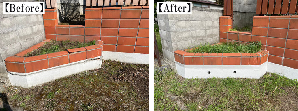 正面の花壇にはブロックが欠けた部分とコンクリートにひび割れがありましたが、いずれも補修して元の姿に戻りました。