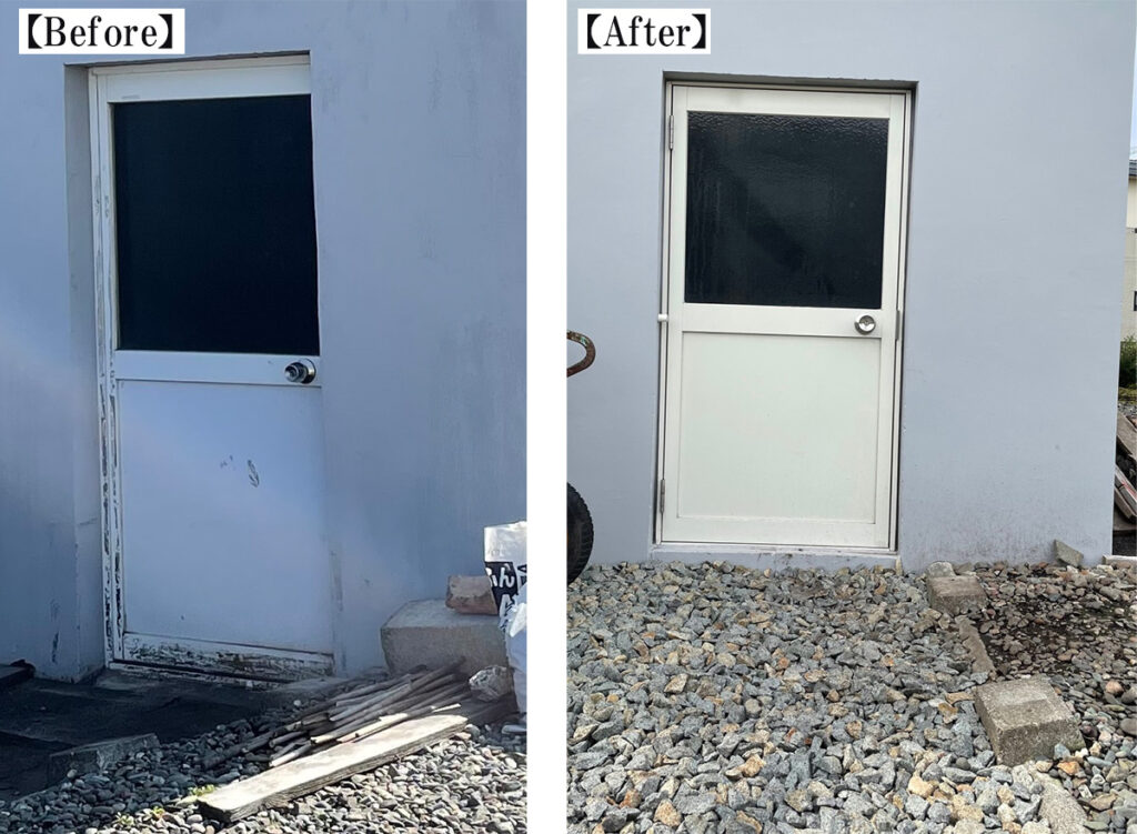 そこで、まずドアの下にブロックを積み上げ、外側に傾斜するように砕石を敷いて、雨水が浸入しにくいように逆の傾きにしました。また、内開きタイプだったドアを外開きタイプに交換しています。