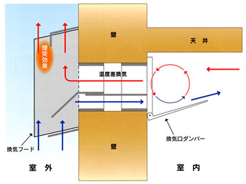 『グッドマン』は、上のイラストのようにダンパー上部で外気と室内の空気が混ざり合うため、冷たい外気が直接入る冬にも寒さを感じる心配がありません。加えて『グッドマン』は、エネルギーを使うことなく同時給排気が可能なので、1部屋単位でも換気でき、音漏れも解消できます。