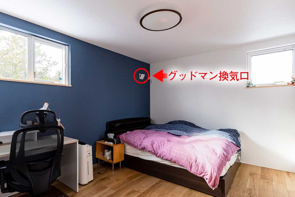 当社のパッシブ換気システムは、各部屋の排気口に給気も同時に行うことができる『グッドマン』換気口を採用しているのが特徴の一つです。