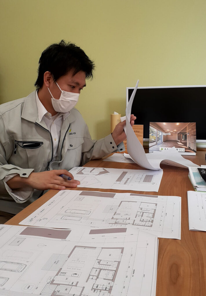 拓友建設に入社後、現場中心の仕事からガラッと変わり、デスクワークが増えました。今は一つひとつの仕事を覚えながら、図面や見積もりといった書類作りなどを行っています。一方で、図面から必要となる建材の数量を把握すること、またリフォームのような小規模工事での作業など、大工時代の経験も活かしながら、仕事に取り組んでいます。