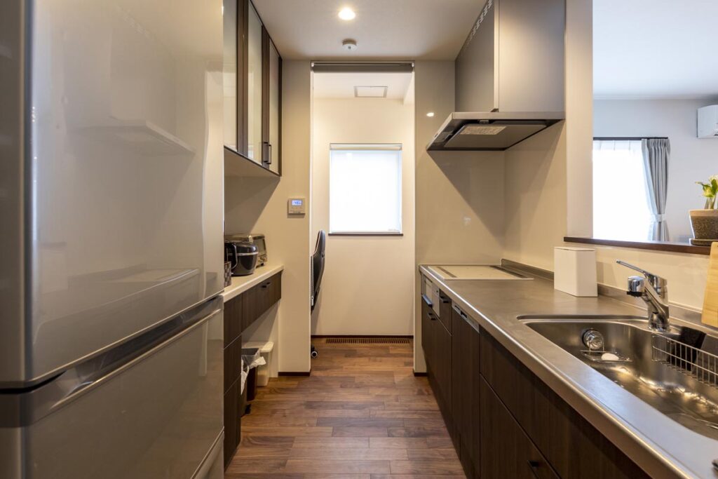 こちらは、当社が施工したFさま邸のキッチンです。キッチンの奥に家事室を設け、お子さんの学校関係の書類の整理などに使っています。