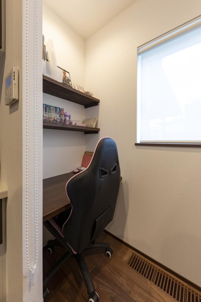 中には壁付けデスクを設けています。ロールスクリーンを下げれば、独立したスペースに早変わり。ひとり時間に没頭できる空間になります。