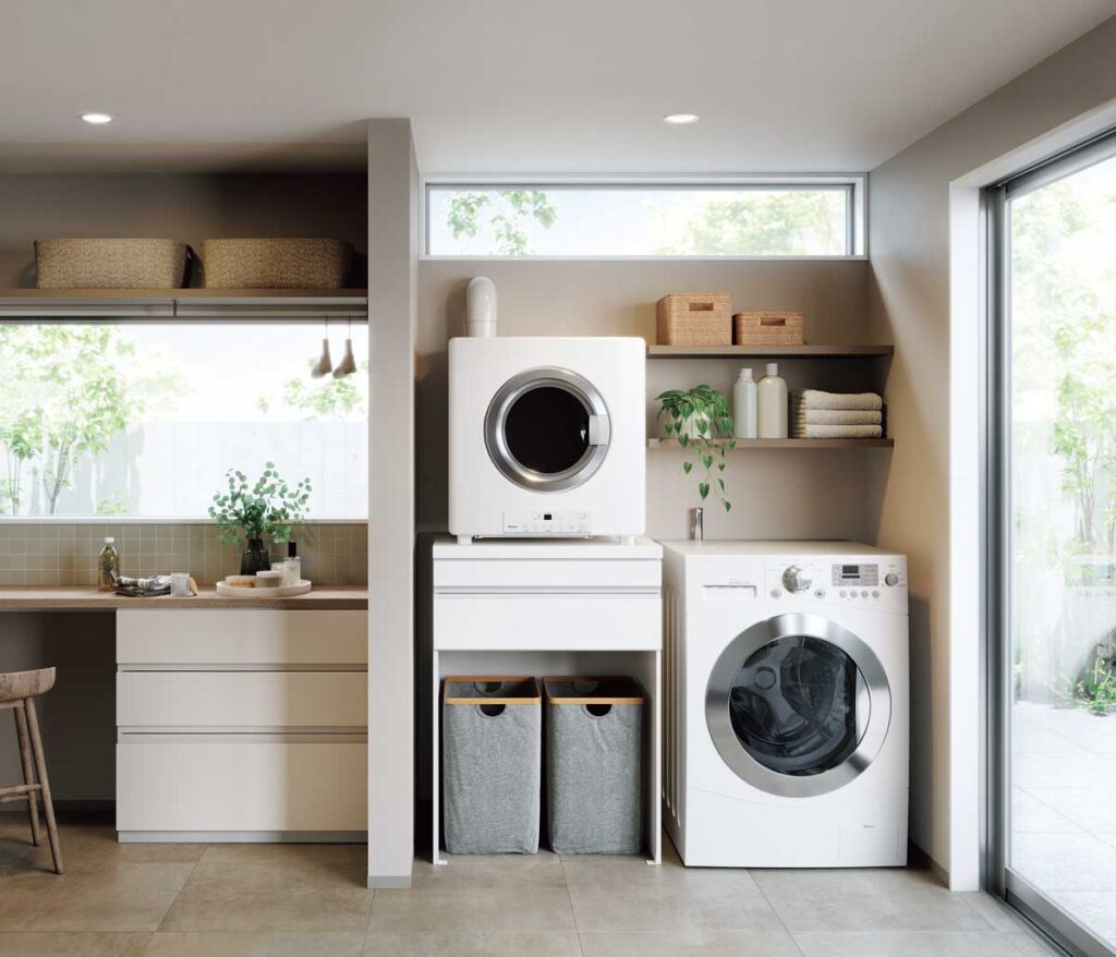 最近、洗面脱衣室やランドリールームでおなじみの設備となりつつあるのがガス衣類乾燥機「乾太くん」です。パワフル温風で洗濯物がすぐに乾かせて家事の時短になることから、共働き世帯を中心に採用するご家庭が増えています。 「乾太くん」本体の重量は乾燥容量5㎏タイプで40kgほど。ここに洗濯物が加わった重さに耐えられる棚を造作する必要があり、その費用は約20数万円になります。