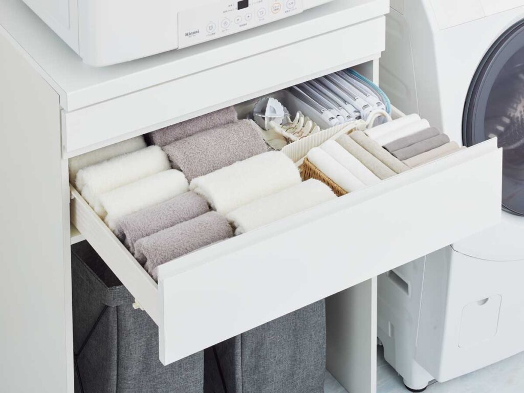 そうした中、住宅設備メーカーの永大産業(本社:大阪市)さんが今年2月、乾太くん専用の収納ユニットを発売しました。「専用」なのでサイズはピッタリ。カウンターは、小柄な方でも洗濯物をラクに出し入れできる高さに設計されています。さらに、洗濯物を畳むのに便利なスライドカウンターや、洗濯ネットなどの小物がしまえる引き出しも付いています。