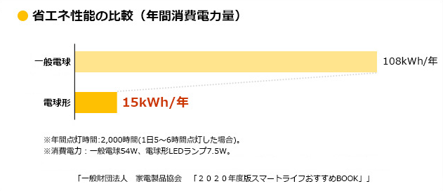 まずは照明器具です。一般電球を電球形LEDランプに換えた場合、年間消費電力量は約86%減らすことができます。