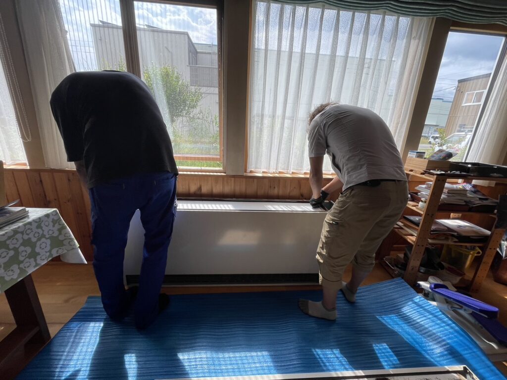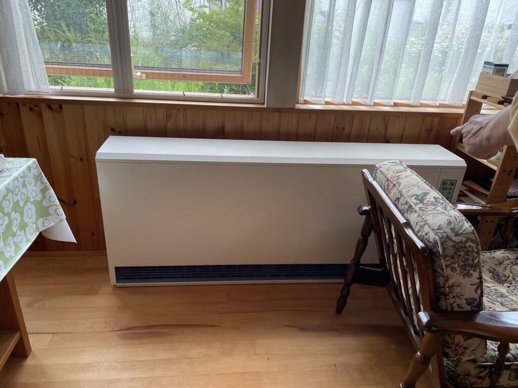温水パネルヒーターに交換しました。その他の部屋も含め、全部で6カ所あった蓄熱暖房機を各部屋の大きさに合わせたサイズのパネルヒーターに取り替え、新しく洗面室にも設置しました。