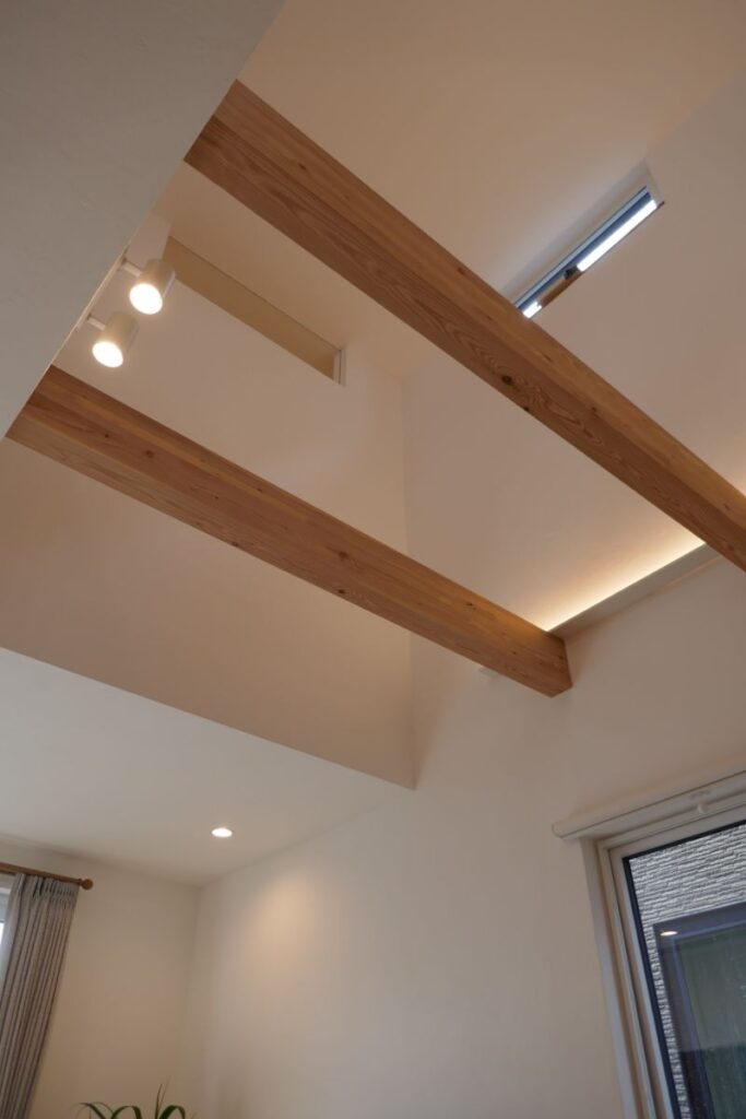 リビングは、南に面した窓から十分な光を採り入れながらも、夏場の直射日光を避けられる設計となっています。冷房の使用量を減らす省エネの工夫です。