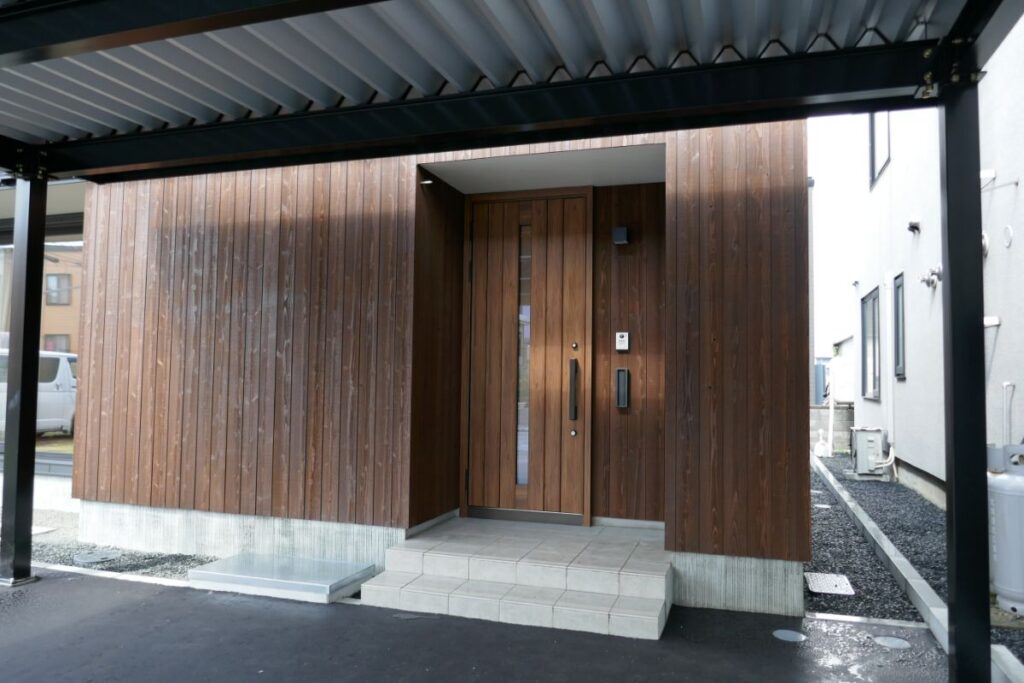 こちらが外観です。2階正面のブラックの壁面に見える部分は、実は太陽光発電パネル(シャープ製)。出力3.8kWとそれほど大容量ではありませんが、雪が積もる心配がないこと、また屋根の雪を落とす場所の少ない札幌市内などの都市部でも設置が可能な創エネ・自家発電設備のご提案として採用しました。