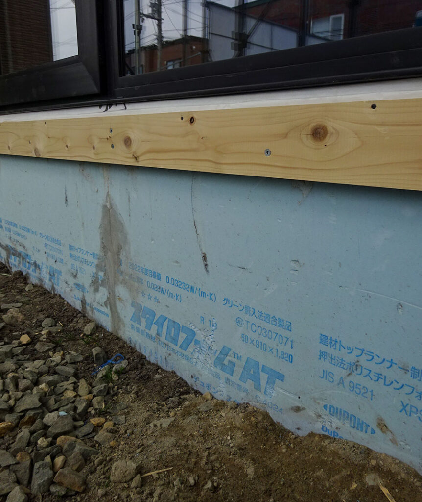 完成してからでは見ることができない部分にもチェックいただきたいポイントがあります。こちらの写真は工事中。基礎をまるごと保温する断熱材に、シロアリを寄せつけない効果が実証されているスタイロフォームATを採用しています。