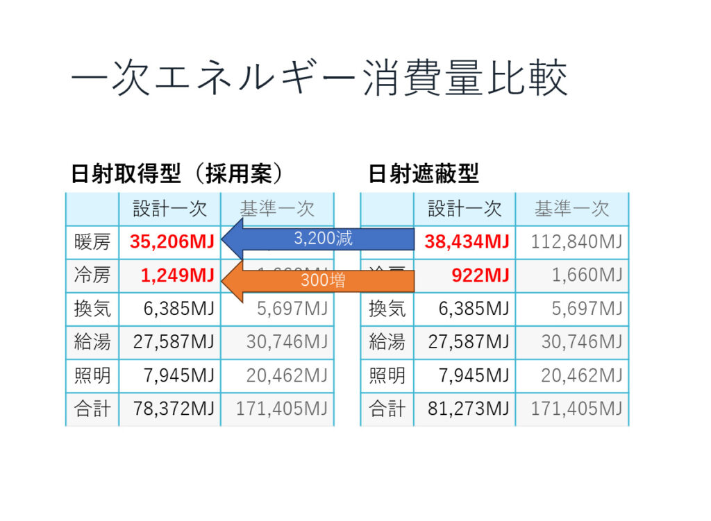 こちらは、窓ガラスを日射取得型にした場合と日射遮蔽型にした場合でどちらが暖冷房エネルギーを減らせるかシミュレーションしたものです。日射取得型は日射遮蔽型に比べて、冬場の暖房消費量は約3200MJ少なく、一方、夏場の冷房消費量は約300MJ多くなっています。夏の冷房消費量は増えるものの、暖房費の削減効果はその10倍と大きく、年間トータルでエネルギー消費量の削減につながりそうです。このシミュレーション結果を踏まえて、Tさま邸の窓には南面と西面に取得型、それ以外に遮蔽型のサッシを採用しました。 (※MJとは熱量の単位ですが、やや難しいのでここでの説明を省略します)