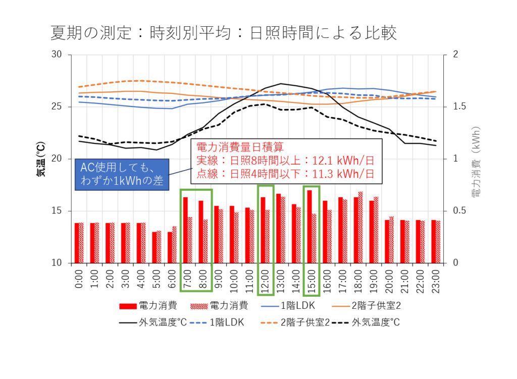 興味深いのが、冷房に使った8月の電気使用量を日照時間が長い日と短い日で時間別に比較したものです。日射が1日8時間以上(晴れ)の場合と、1日4時間以下(曇りか雨)の場合を比べたところ、1日の電力消費量の差は、1kWh程度。この差は、エアコンの消費電力分と推定され、その金額は1kWh=わずか30数円です。また、室温は概ね26.5度以下と快適な温度帯をキープ。断熱性の良さは、エアコンの効きがよくなり、省エネにつながっていることが分かります。