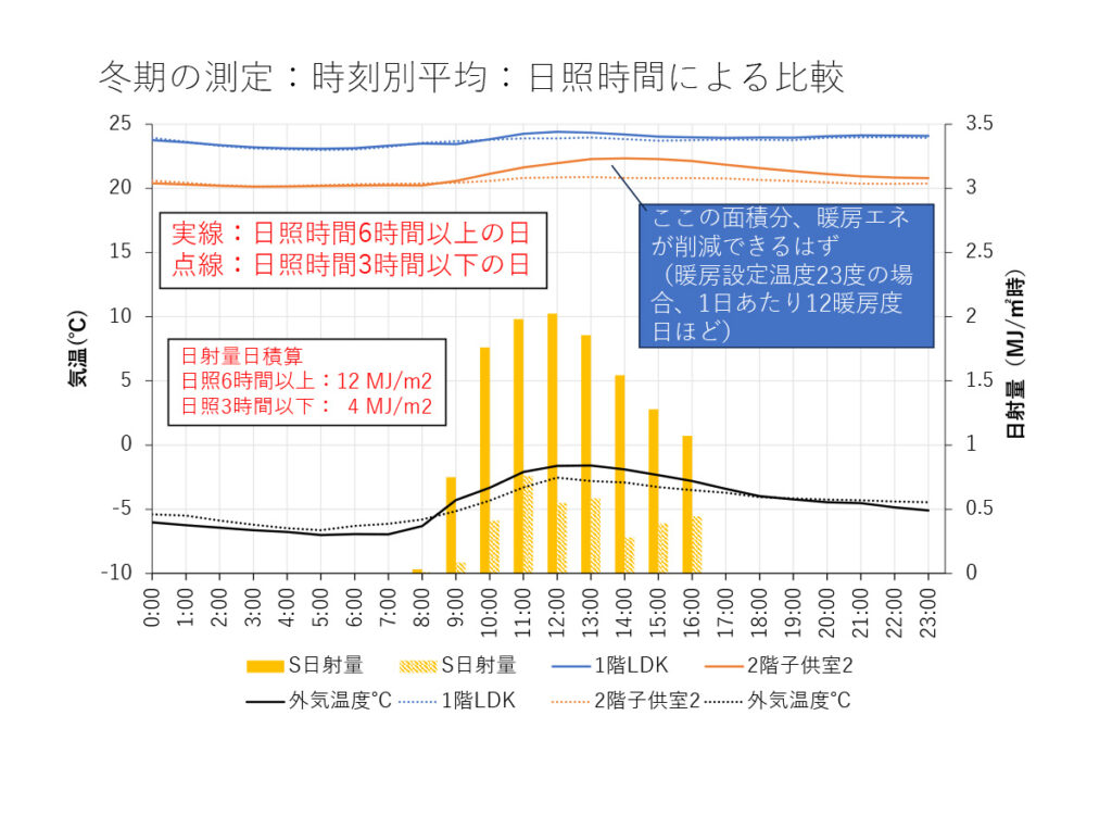 また、冬期(2023年1月22日~2月18日)の1ヵ月間、日射が1日6時間以上の場合と3時間以下の場合の温度変化を比較したところ、日射があると2階子供室では、室温の上昇が見られます。細かい部分についてはもう少し詳しく見る必要があると思いますが、日射があってもなくてもガス使用量は少なくなることが分かりました。