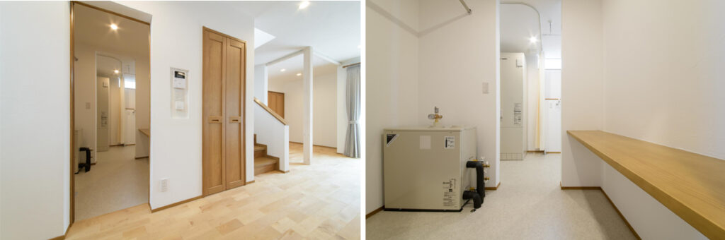 間取りの工夫でも「採用してみたい」とのお声をいただきました。LDKと洗面・脱衣室を行き来できる通路を広げて家事室としてプラン。洗濯物干しがあり、カウンターでは乾いた洗濯物を畳んだりアイロンがけができるようになっています。