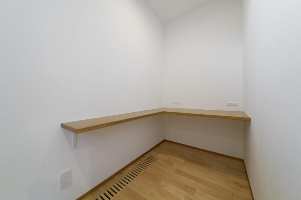 キッチン横の作業スペースはLDKからは見えない位置になっているので集中できる環境です。コンセントを3カ所設置しているのでテレワークにも活用できます。