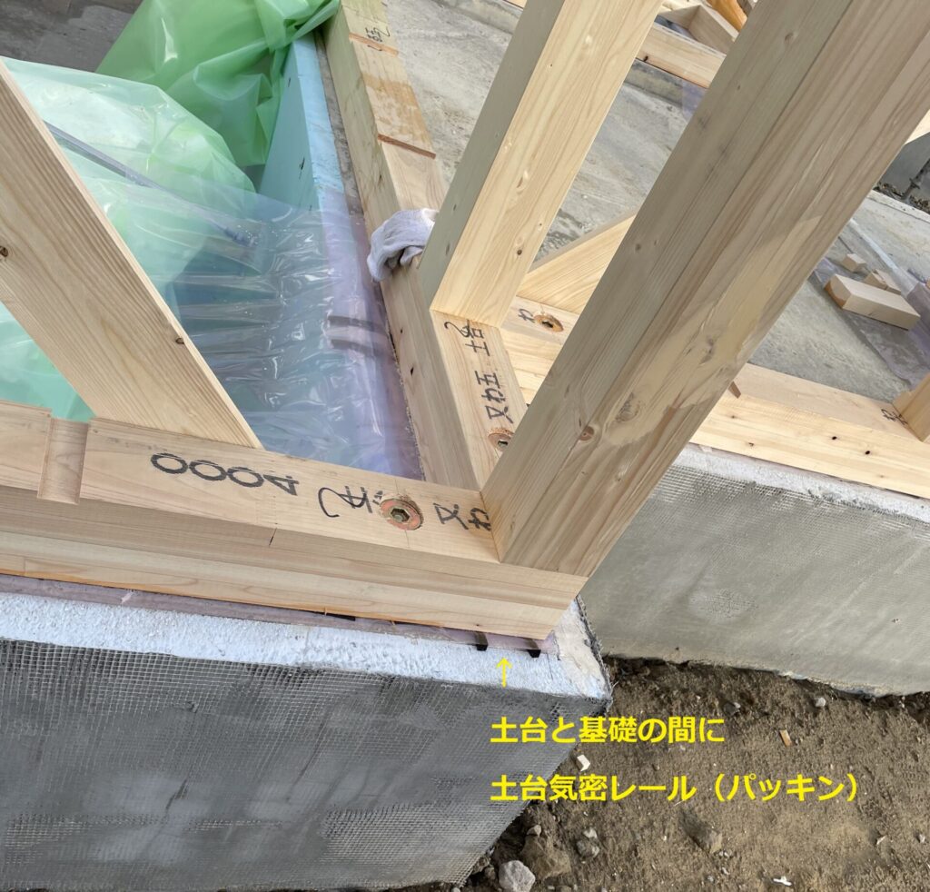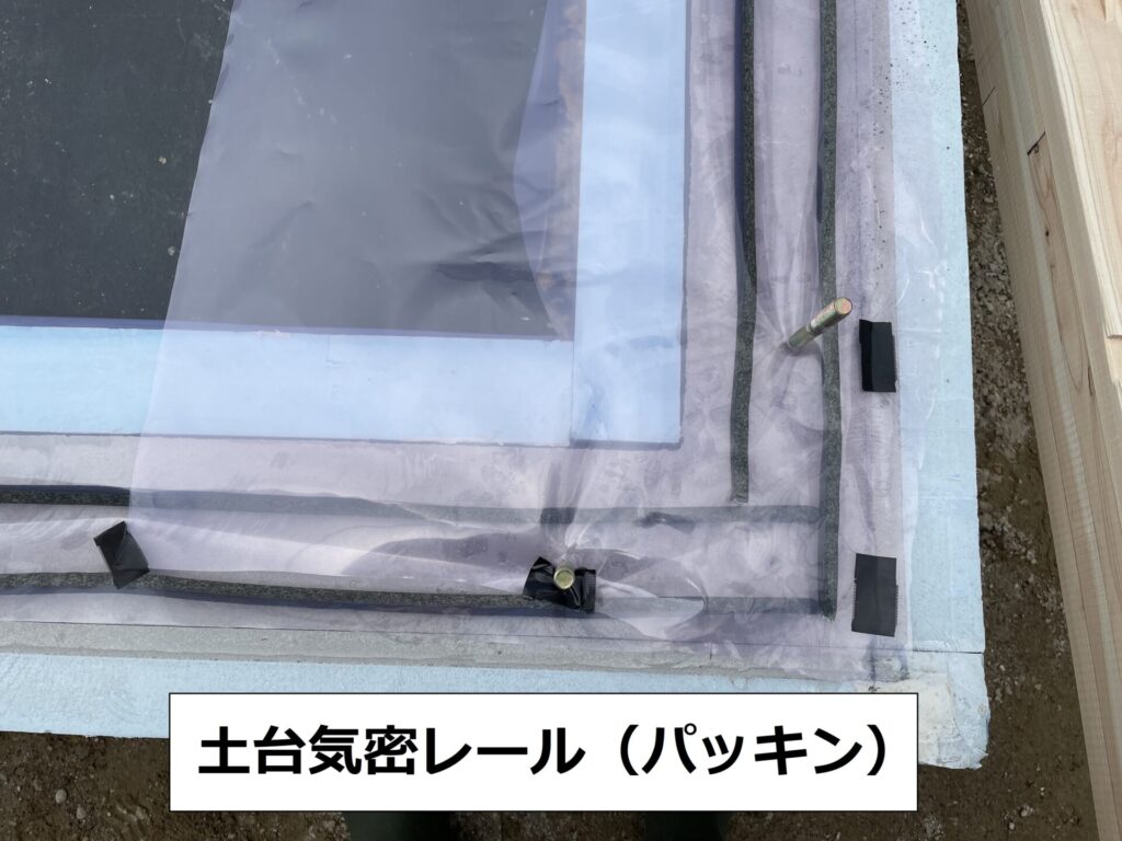 その前に基礎と土台の間には「土台気密レール」を使って隙間を無くすための施工をしています。