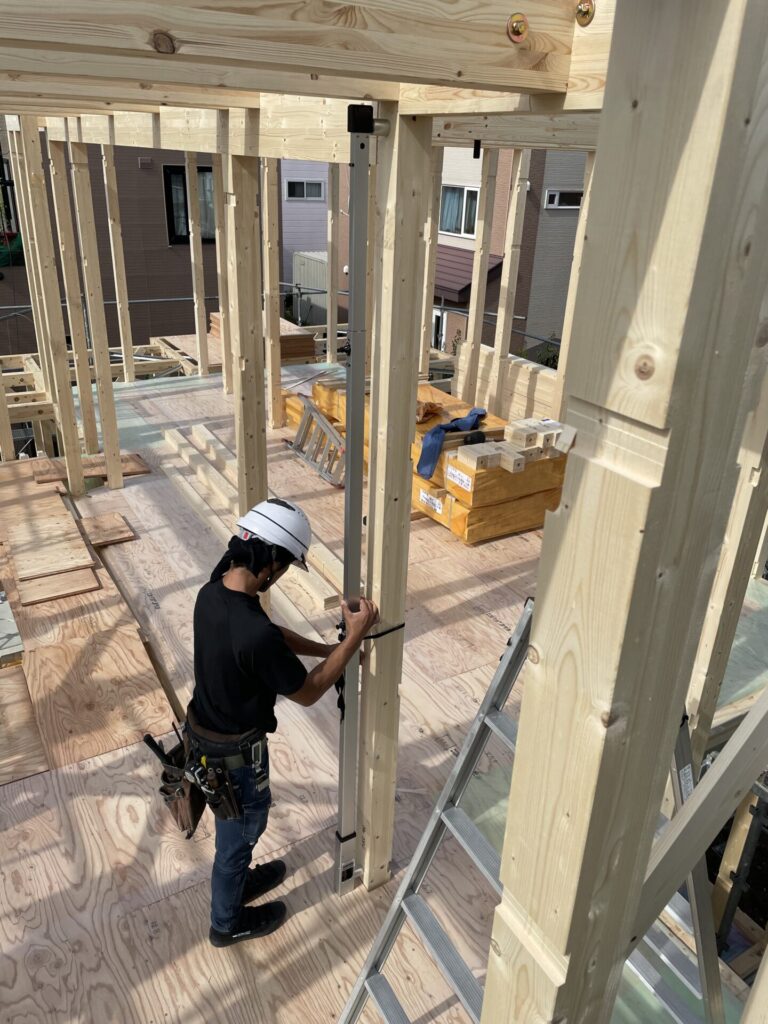 防風下げ振りという道具で、柱が垂直になっているか確認中