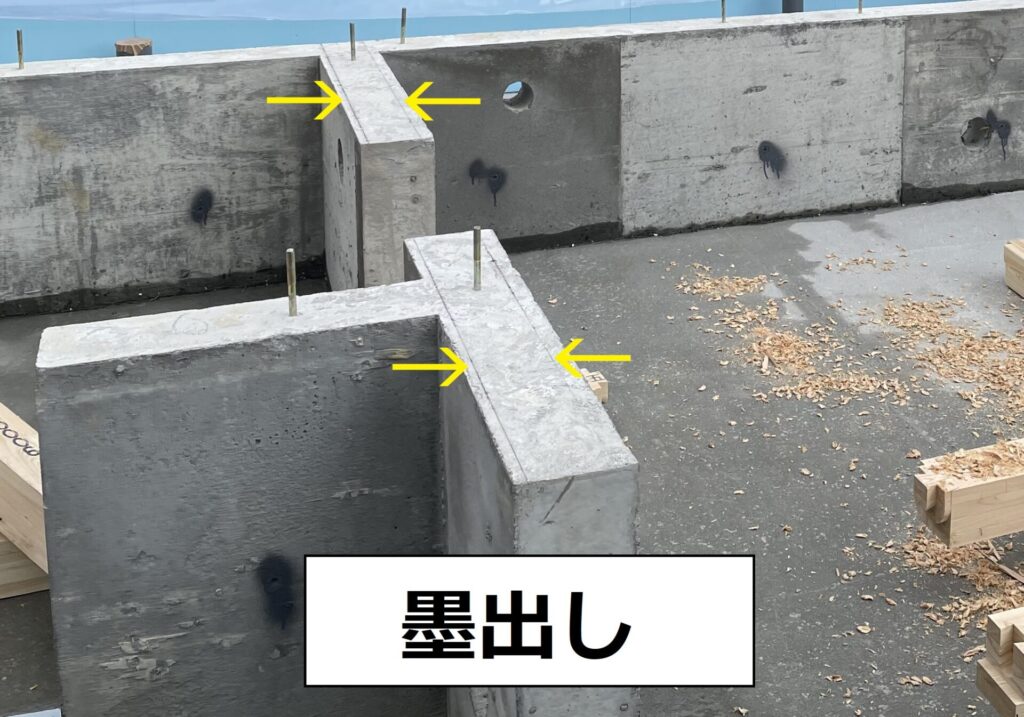 まず最初に基礎の天端に墨出し土台を設置していくのですが、