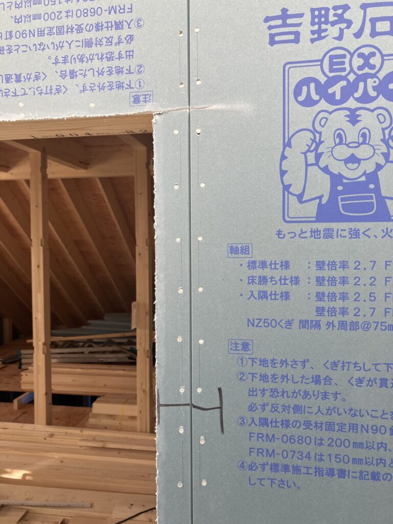 合板を貼る際も、ビス(認定品)のピッチは仕様規定通りに打っています。