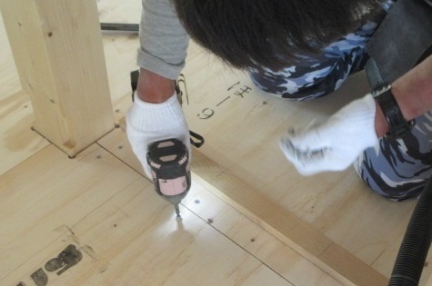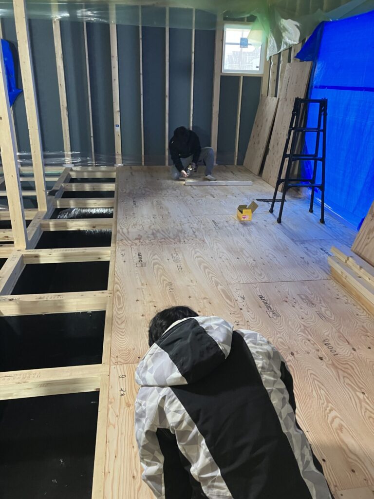 耐力面材を貼り終えたあとは、1F 根太レス合板(JAS適合の構造用合板)を貼っています。
