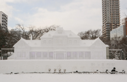 札幌では先日、さっぽろ雪まつりが4年ぶりに3会場で開催されました。写真は大通り会場に造られた旧札幌停車場の大雪像。1908年に建てられた三代目札幌駅の駅舎です。明治の当時、ルネサンス様式を採用した木造2階建ては流行の最先端で、話題のハイカラ建築だったようです。雪でこれだけ緻密に建築物を再現できるのは本当にスゴイですね!