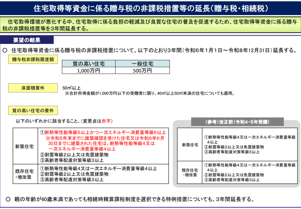 そのほかの条件として、直系尊属にあたる父母や祖父母からの贈与であることや贈与を受ける人が18歳以上であること、住宅の床面積など複数の項目があり、そのすべての条件を満たす必要があります。詳しくは、国税庁のホームページをご覧ください。