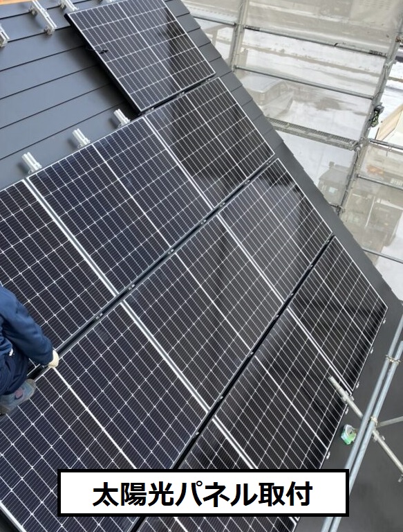 勾配屋根での作業となるため、クレーンを使ってパネルを持ち運んでいる所です。
