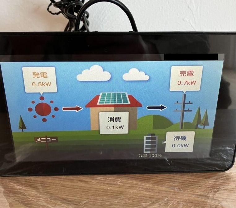 こちらは太陽光の発電状況・電気の使用量・蓄電池の残量・売電状況が分かるモニター