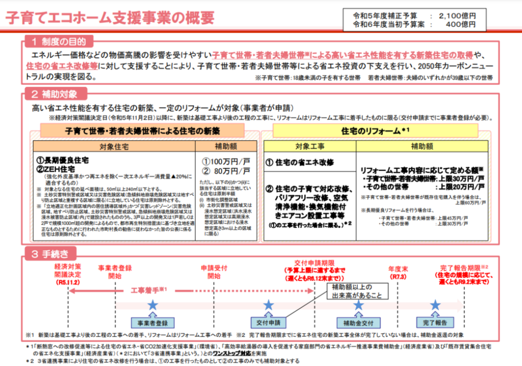 ポイントは、「エコホーム」という事業名にあるように、一定レベルの省エネ性能をクリアした新築住宅、リフォームが条件になっていること。