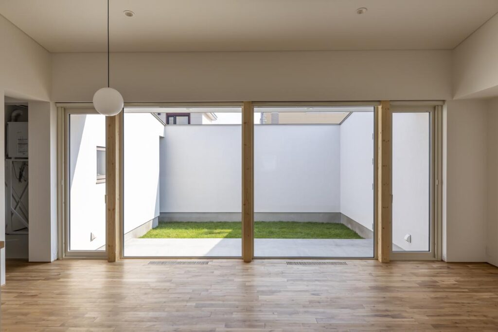 こちらはお子さまの外遊びに最適なインナーコートのある平屋建てです。リビングダイニングからお子さまの様子がバッチリ見守れる間取りです。