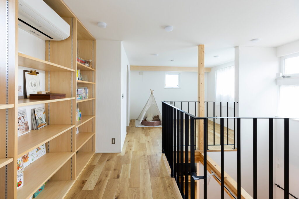 こちらは、就寝前に絵本を読むのが日課のお子さまのため2階ホールに可動式本棚を造作した実例です。また、「子育てエコホーム支援事業」の昨年度版「こどもエコすまい支援事業」の対象になり100万円の支給を受けています。