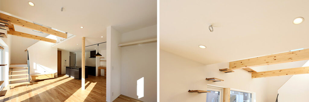 こちらのお宅では、リビングにキッズスペースを併設(写真左)しています。天井にはハンモック用の金具、壁にはキャットウォーク(写真右)を設けてお子さまと猫ちゃんがともに楽しく暮らせる家になりました。