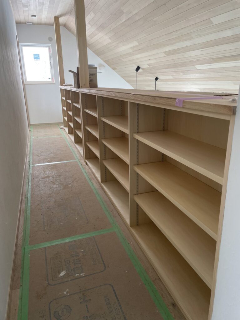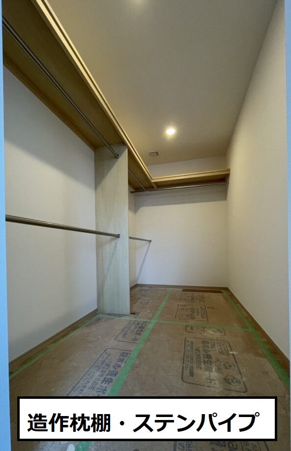 ウォークインクローゼット:造作の枕棚とステンパイプを取付