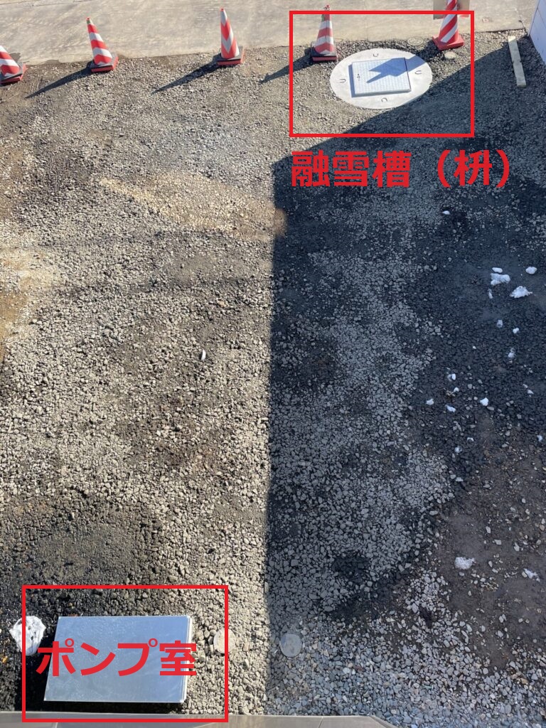 ポンプ室は建物側、融雪槽の位置は車を停める事を考慮し道路側に設置しました。