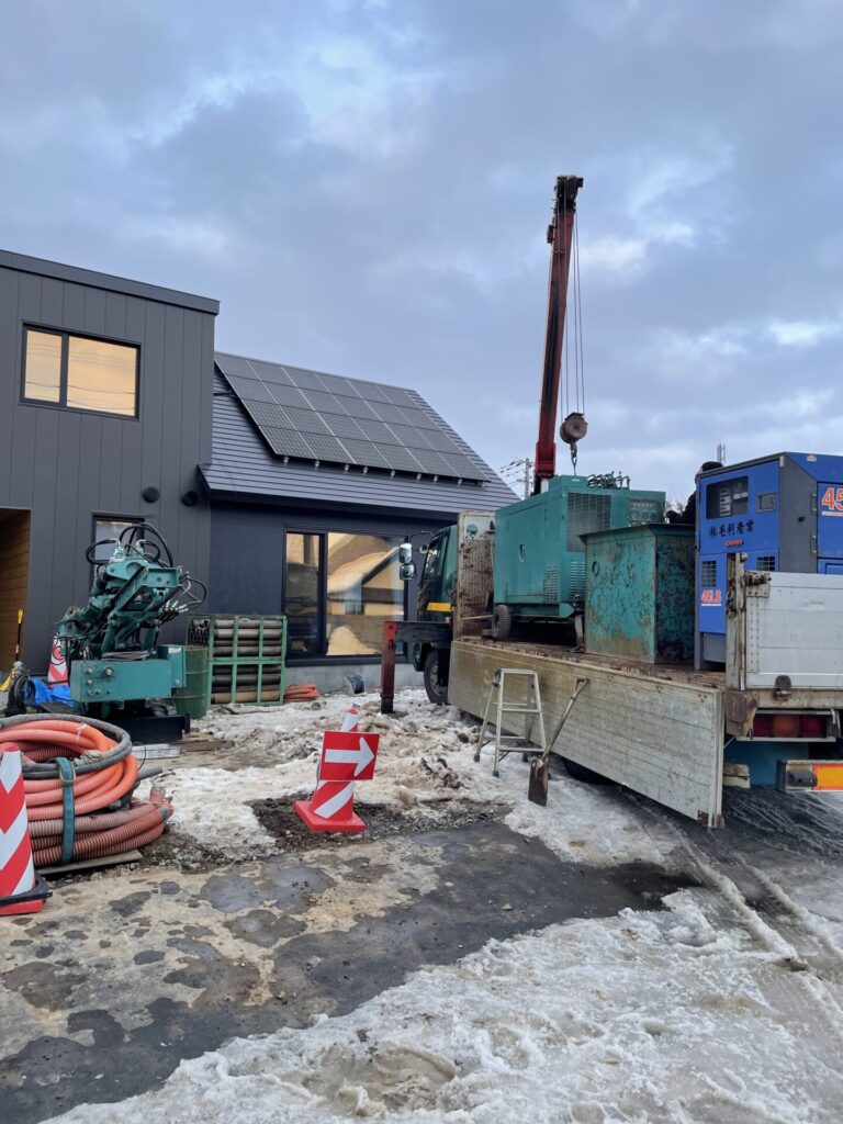 モデルハウス工事は、先日より地下水利用の融雪槽工事に取りかかり、数日前に無事設置が完了しました。