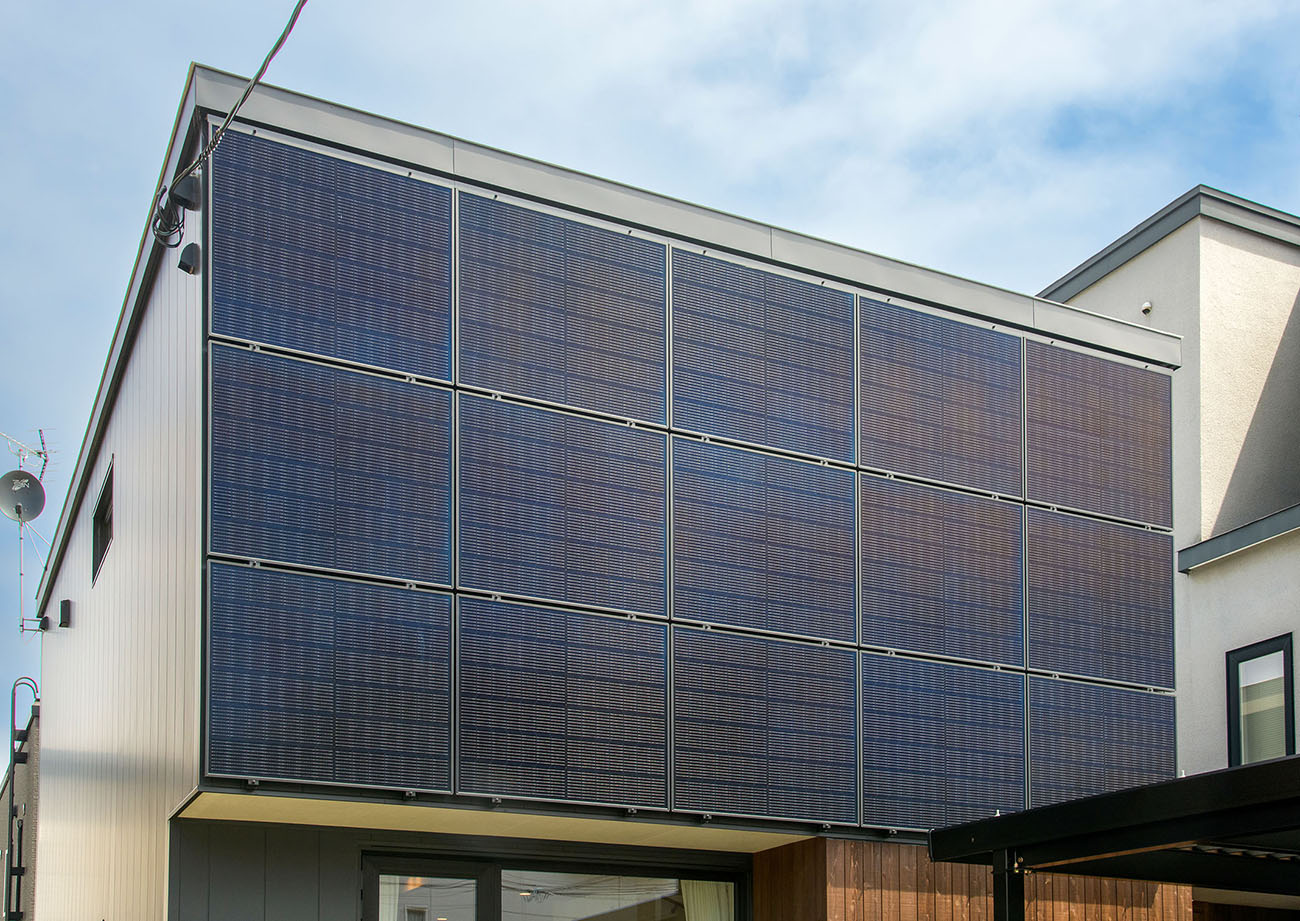 こちらが番組内に登場した壁面太陽光発電です。番組の中で「以前のアパート暮らしの頃に比べて光熱費が半分になった」というオーナー様の声が紹介されていました。この機会に、最初の冬の電気代や太陽光発電の発電量などについて、オーナー様に詳しく教えていただきました。
