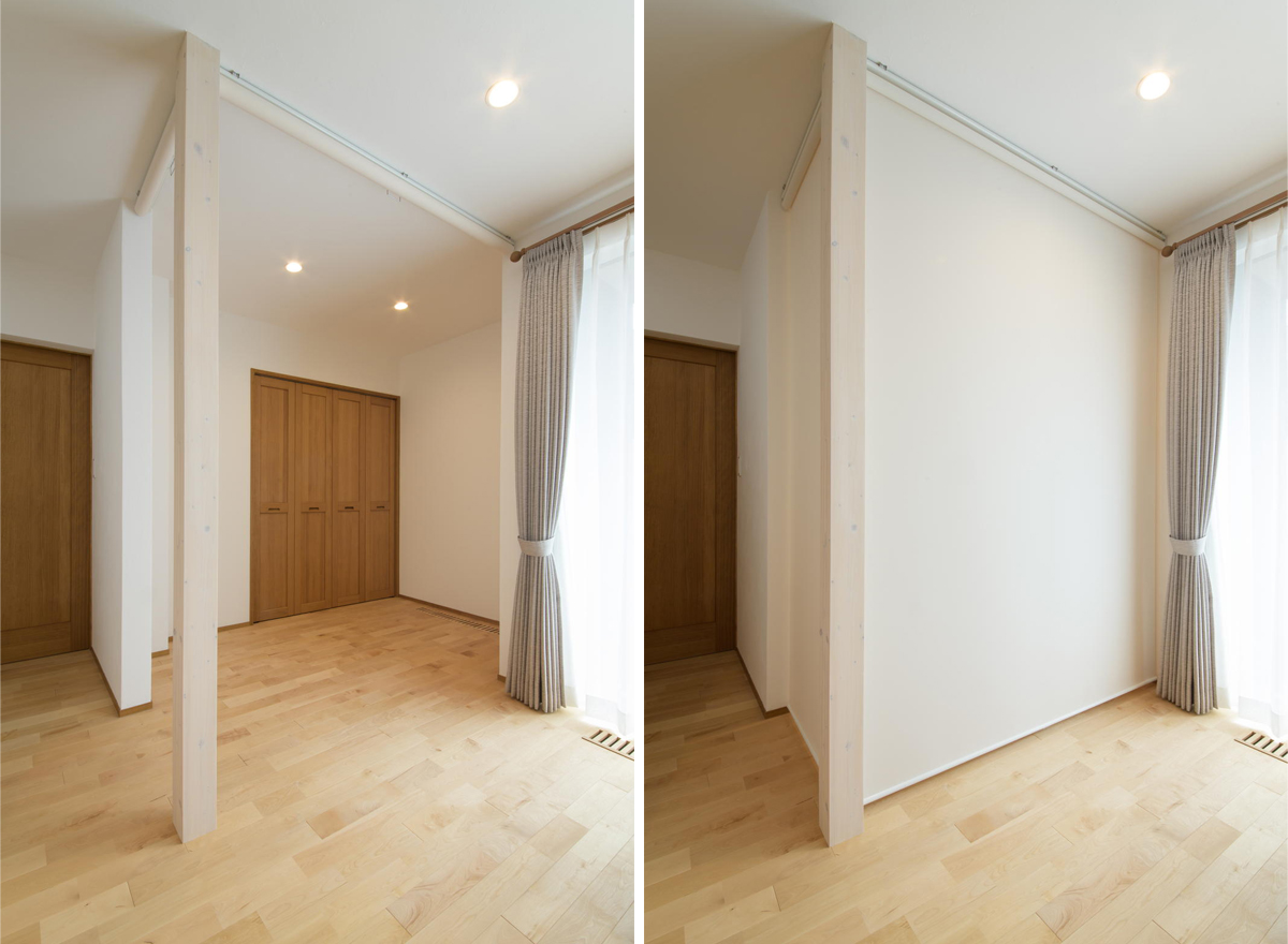 子ども達は、リビング横のキッズスペースが大好きです。ロールスクリーンを下ろし、よく隠れてコッソリ遊んでいます(笑)。