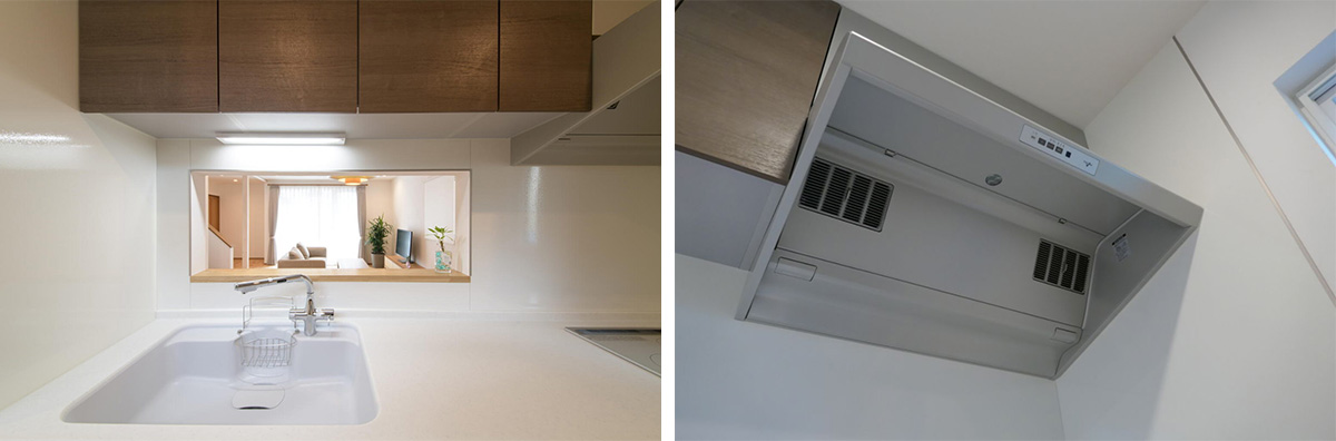 独立タイプのキッチンは、手元が隠れているので、リビング側からの視線が気になりません。お客さまが来ている時でも、後から片づければいいので、焦らずゆっくりと過ごせますね。また、トクラスのサイクロンフードはお手入れがしやすく、家事の負担が減りました。