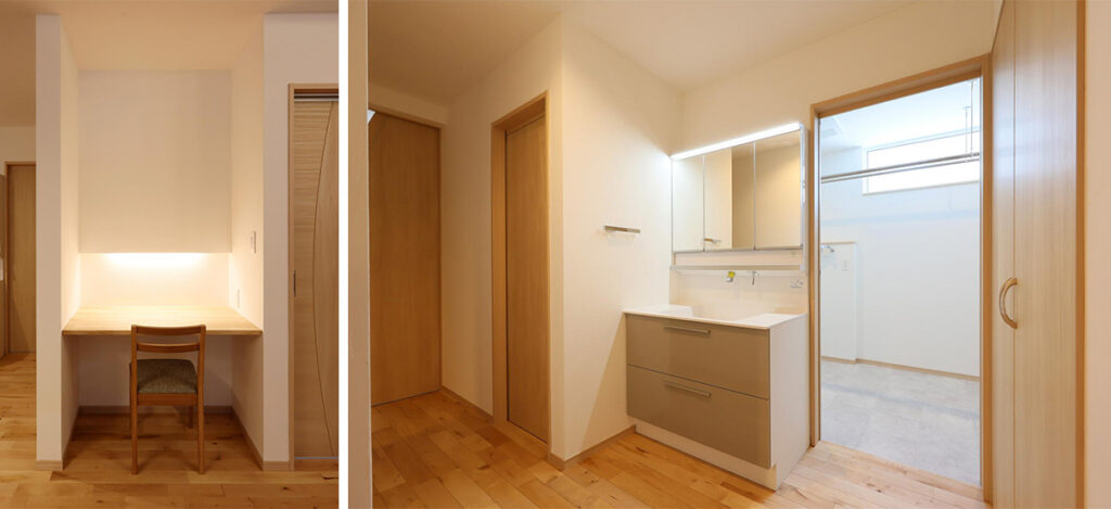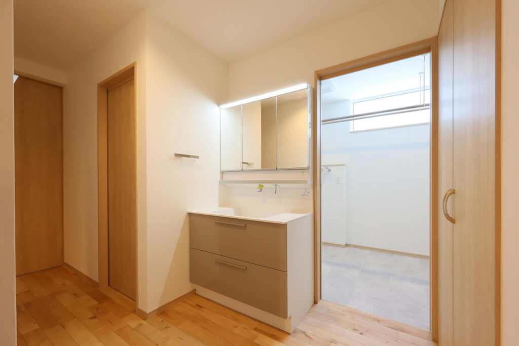 洗面台はユーティリティを出てすぐの場所に配置しており、「ユーティリティ内が広々と使えていい」と、水回りの配置を気に入ってくださるお客さまもいらっしゃいました。